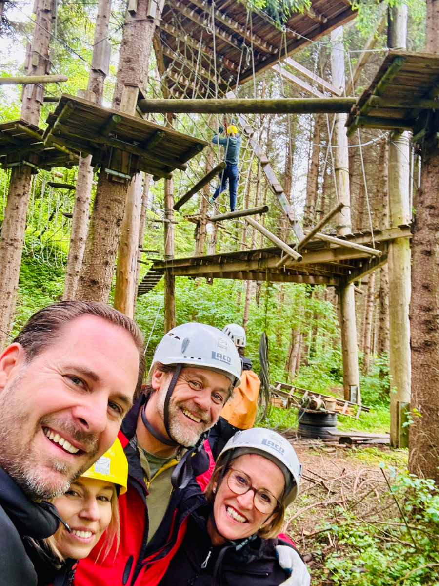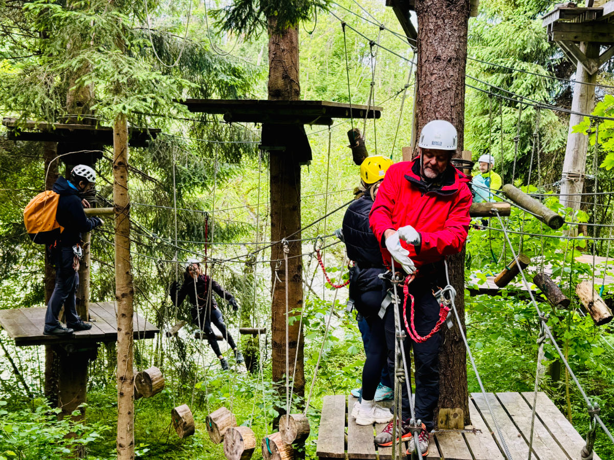 Bei zunächst strömendem Regen, aber bester Laune wurden die ersten Klettergurte angelegt und die Parcours erkundet. Mut, Geschicklichkeit und Teamgeist waren gefragt, als es über schwankende Brücken, rasante Seilrutschen und knifflige Hindernisse ging. Jeder konnte seine eigenen Grenzen austesten und dabei die Kolleginnen und Kollegen von einer ganz neuen Seite kennenlernen.