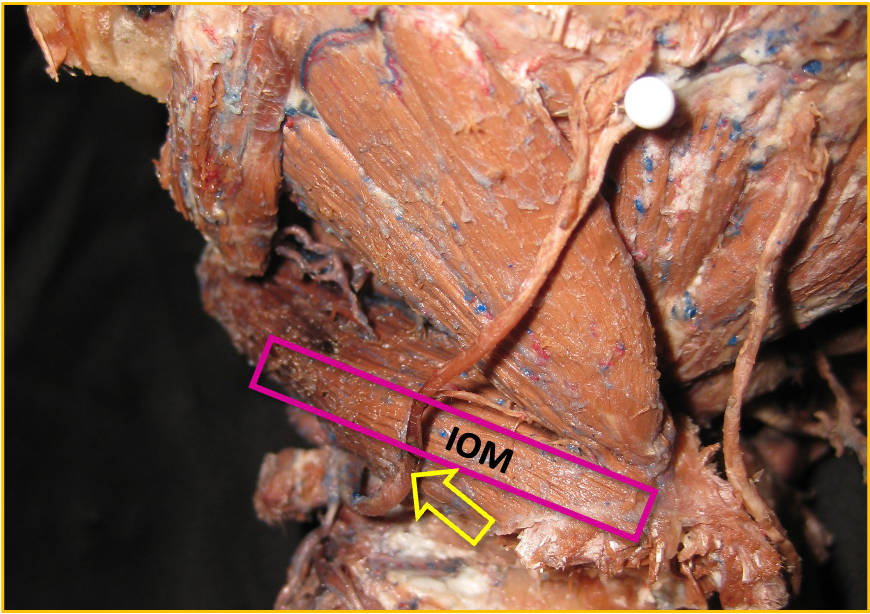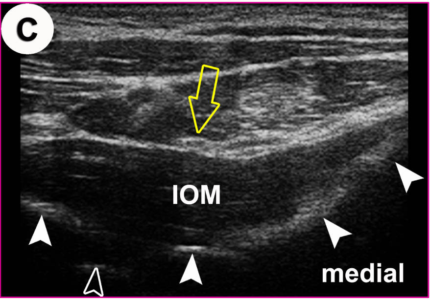 Der hell erscheinende N. cutaneus femoris lateralis (Pfeil) wird am Oberschenkel in seinem „fettgefüllten Flachtunnel“ (im US dunkel!) am leichtesten aufgefunden: “POV“ (Point of Optimal Visibility) nach Prof. Moriggl.