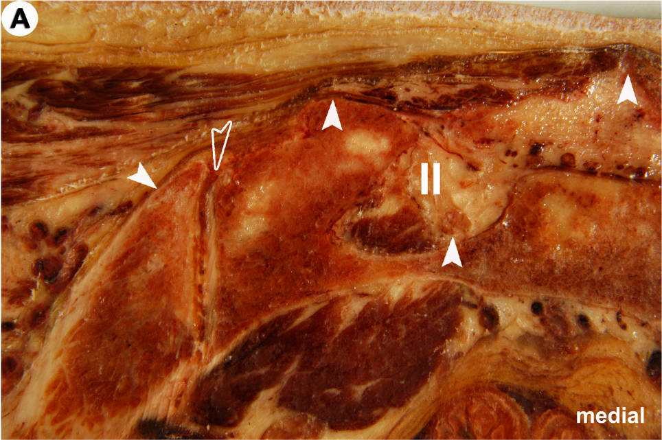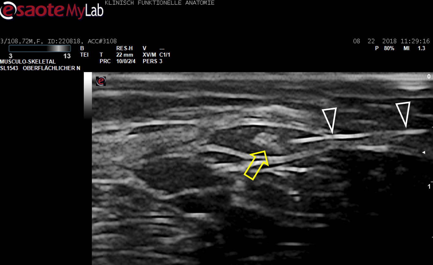US-Darstellung und experimentelle Blockade (Pfeilköpfe: Nadel) des N. cutaneus femoris lateralis an einer Körperspenderin. Mittlerweile gängige Anwendung in der Regionalanästhesie und Schmerztherapie