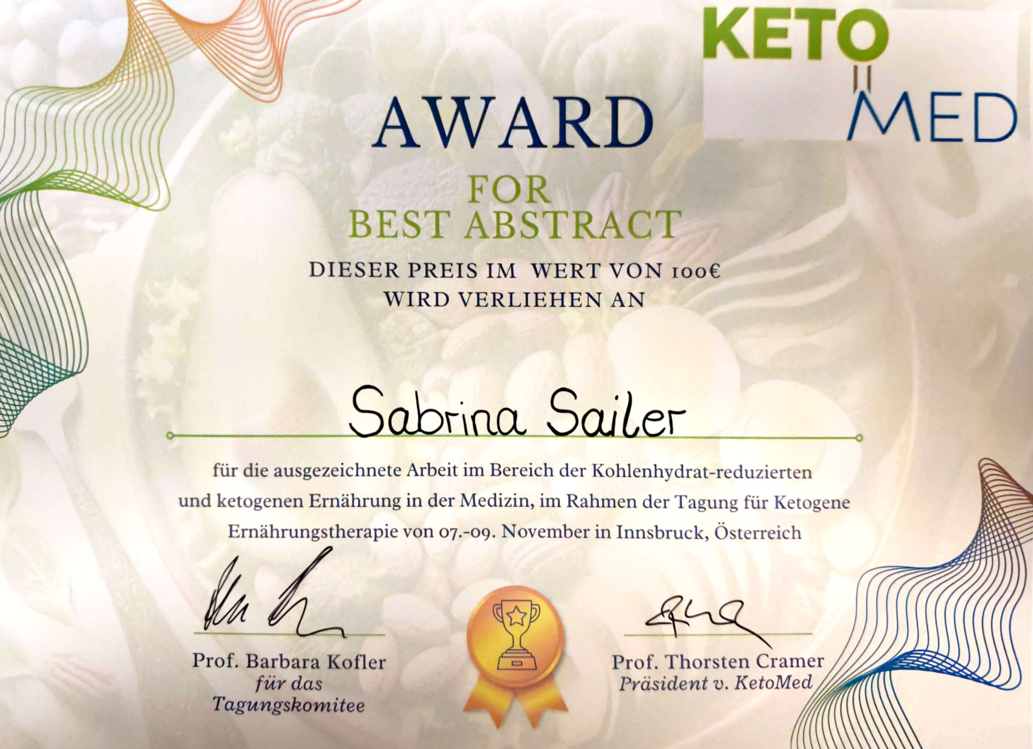 Sabrina Sailer represented us at the first KetoMed Conference (https://keto-med.com). She presented new findings on acylcarnitine analysis and ketosis and received an award for her contribution. The meeting also offered close interaction with patients and families affected by rare diseases in which the ketogenic diet serves as an important treatment.