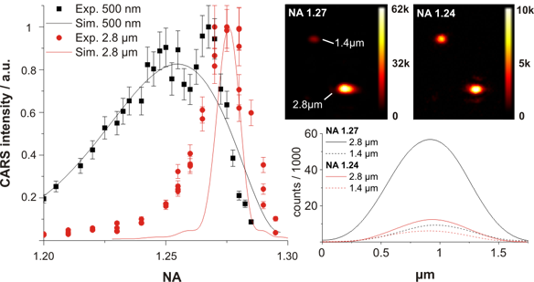 The graph on the left of Fig. 2 shows the CARS signal strength generated in polystyrene beads of different sizes in water, measured at different pump beam incidence angles (expressed in terms of NA). Setting the NA to specific values alters the signal ratio between the small and large beads.