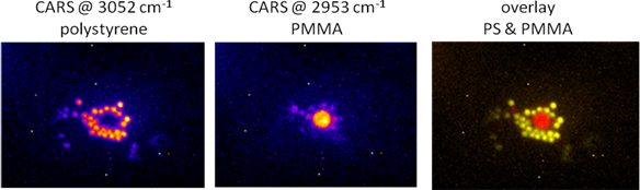 The movies shown in Fig.3 demonstrate real time imaging of polystyrene beads in water at the resonances at 3052cm-1 and 1600cm-1. Each frame in the movies contains the CARS signal that was created by a single pump/Stokes pulse pair.