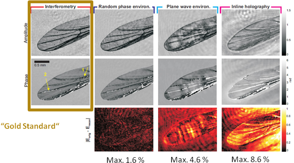In a recent project complementing our SLM-imaging activities we have applied speckle patterns (generated by a diffuser plate with a central hole or by a pseudo-random phase pattern on a SLM) for “lensless holographic imaging”, i.e. for holographic phase retrieval of an unknown amplitude or phase object.