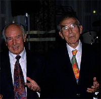 Im Jahre 2003 wurde H. Glossmann das Österreichische Ehrenkreuz für Wissenschaft und Kunst 1. Klasse verliehen. „Er hat wissenschaftliche Pionierarbeit auf dem Forschungsgebiet der spannungs-abhängigen Calciumkanäle der Plasmamembran geleistet […] Auch das Smith-Lemli-Opitz-Syndrom wurde in seiner Arbeitsgruppe erstmalig molekular durch Klonierung des Gens aufgeklärt. Auf Initiative dieses so verdienstvollen Forschers und Hochschullehrers […] wurde außerdem ein gemeinsames internationales Doktorat zwischen den Uni-versitäten Padua und Innsbruck errichtet. Dabei handelt es sich um das erste Programm in Österreich, das auf Grundlage der EU-Konferenz von Prag im Mai 2001 einen wichtigen Schritt zur Verwirklichung des Europäischen Hochschulraumes setzt“(Aus der offiziellen Pressemitteilung) Bild links: H. Glossmann freut sich mit seinem Vorgänger em. o.Univ.-Prof. Heribert Konzett (+2004) – ebenfalls Ehrenkreuzträger – über die hohe Auszeichnung. |