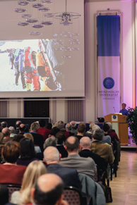 Sichtlich erfreut über den großen Andrang eröffnete ALUMN-I-MED-Präsident Christoph Brezinka die Veranstaltung am 12. Dezember 2017. Die Absolvent:innenorganisation der Medizinischen Universität Innsbruck, ALUMN-I-MED, hatte Peter Habeler zum Festvortrag anlässlich des zehnjährigen Vereinsjubiläums eingeladen. ALUMN-I-MED ist das Netzwerk für Absolvent:innen, Freund:innen, Mitarbeiter:innen und Förder:innen der Medizinischen Universität Innsbruck. „Ärztinnen und Ärzte erleben immer wieder Grenzerfahrungen und stehen vor schwerwiegenden Entscheidungen. In der medizinischen Forschung wird bisher Unmögliches möglich gemacht. Peter Habeler kann uns daher viele Anregungen geben“, sagte ALUMN-I-MED Präsident Christoph Brezinka.