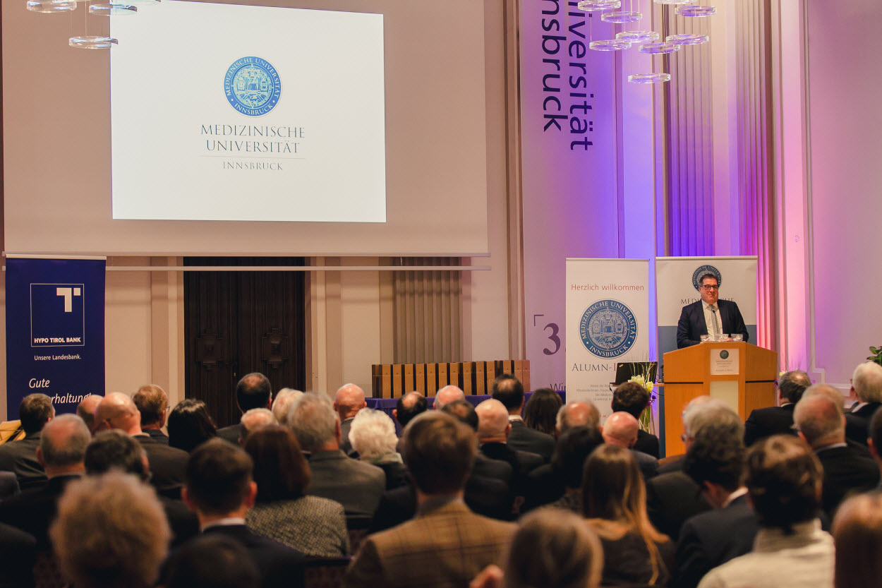 Rektor W. Wolfgang Fleischhacker und ALUMN-I-MED Präsident Christoph Brezinka luden am 16. Jänner 2019 wieder gemeinsam zum traditionellen Neujahrsempfang der Medizinischen Universität Innsbruck. Mehr als 200 Ehrengäste, Mitarbeiter:innen, Absolvent:innen, Studierende sowie Förder:innen kamen in die Aula der Universität, um gemeinsam einen Ausblick auf das neue Jahr zu nehmen.