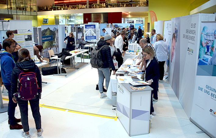 Das Klinisch-Praktische Jahr (KPJ) ist ein wichtiger, abschließender Teil des Medizinstudiums. Im Verlauf ihres Studiums müssen sich angehende Ärztinnen und Ärzte immer wieder mit folgenden Fragen auseinandersetzen: Wo kann ich mein KPJ absolvieren? Welche Lehrabteilung gibt es? Verfügen sie über Unterkunftsmöglichkeiten für KPJ-Studierende? Wie finde ich eine akademische Lehrpraxis? Wie bewerbe ich mich richtig? Zum Ende des Studiums haben die Studierenden viele Fragen. Antworten finden Sie auf der jährlich stattfindenden KPJ-Messe im CCB. Auch in diesem Jahr waren die Stände der Lehrkrankenhäuser sowie Lehrabteilungen unter anderem aus Tirol, Südtirol, Vorarlberg, Salzburg, Oberösterreich und Kärnten gut besucht.