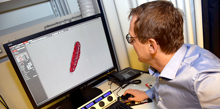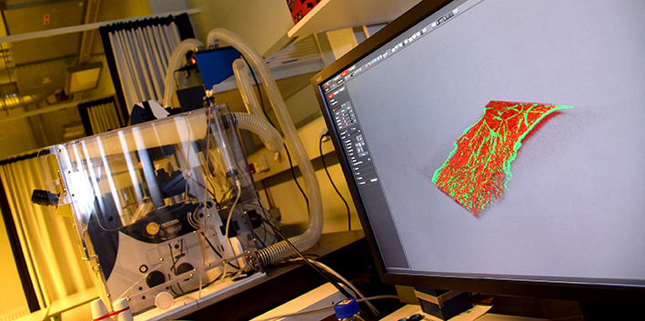 Das bisherige System ist mit einem 592-nm-STED-Laser für grüne Fluorophore und eher dünne Proben (10 bis 15 μm) ausgestattet. Nun wurde die STED-Bildgebung mit einem gepulsten 775-nm-STED-Depletionslaser und einem korrigierten 93x-Glycerol-STED-Objektiv aufgerüstet. „Die Aufrüstung ermöglicht die Verwendung von sogenannten far-red STED-Chromophoren, was einerseits zu stark verbesserten Bleicheigenschaften, da die auf die Probe übertragene Gesamtenergie viel geringer ist, führt und andererseits ermöglicht das Glycerin-STED-Objektiv in Kombination mit dem 775-Far-Red-Laser die STED-Bildgebung von dicken Materialien wie Gewebeschnitten (20-50 μm und mehr)“, erklärt Martin Offterdinger, Leiter der Core Facility Biooptics. Mehrfarbige STEDs sind nun ebenfalls besser durchzuführen. Ein zusätzliches Highlight der Aufrüstung ist die Möglichkeit einer 3-D-STED-Bildgebung, diese wird durch eine „doppelte“ STED Optik in xy- UND in z-Richtung erreicht.