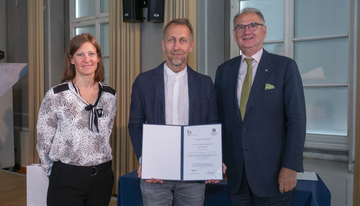 BU: Rachel Guerra (l.) überreichte dem letztjährigen Preisträger Matthias Erlacher (M.) im Beisein von Rektor W. Wolfgang Fleischhacker (r.) die Urkunde.
