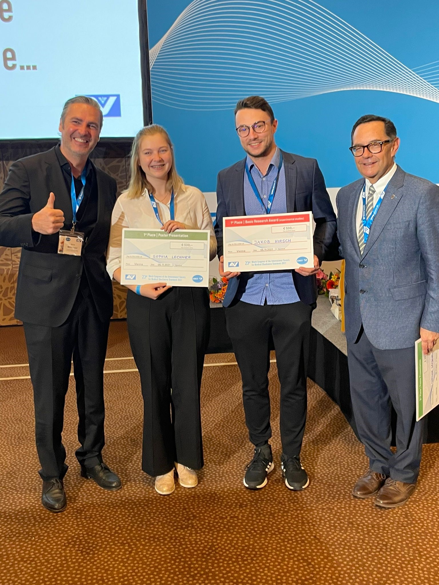Zeitgleich zur Verleihung des Kardinal Innitzer Preises fand in Wien der Jahreskongress der internationalen Stoßwellengesellschaft statt. Hier kamen rund 200 Expert:innen aus verschiedenen Fachkreisen der Medizin zusammen, die sich allesamt mit den regenerativen Effekten der Stoßwellentherapie beschäftigen. Die Innsbrucker Herzchirurgie konnte dabei mit zahlreichen vielbeachteten Vorträgen aufzeigen. Aus dem herzchirurgischen Forschungslabor (Leitung: Johannes Holfeld) wurden dabei gleich drei Arbeiten prämiert: Jakob Hirsch und Felix Nägele erhielten den 1. und 2. Preis des Basic Research Awards, Sopia Lechner den Best Poster Award. Alle drei beschäftigen sich in ihrer Forschungsarbeit ebenfalls mit der Herzmuskelregeneration mittels Stoßwellentherapie.