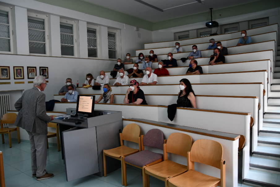 Nach dem Mittagessen in der Mensa der tirol kliniken bei dem die Gäste von Geschäftsführer Stefan Deflorian willkommen geheißen wurden, schnupperten die „Alt-Fachschaftler“ im wieder den Geruch der Vergangenheit, im wahrsten Sinne des Wortes: Denn nach einem Verdauungsspaziergang auf dem Klinikgelände versammelten sie sich im einzigen unveränderten Hörsaal, jenem der Psychiatrie, wo Hans Grunicke über die Entwicklung der Medizinischen Fakultät der 1960er Jahre hin zur Medizinischen Universität von heute referierte. Bei einem geselligen Abendessen im Gasthaus Bierstindl ließen die Teilnehmer:innen des „Altfachschaftler“-Treffens den Abend ausklingen.