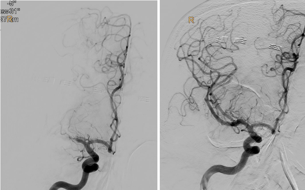 BU: Verschluss des mittleren Hirngefäßes in der Angiographie dargestellt (l.), und wieder eröffnet (r.). Bilder: Univ.-Klinik für Radiologie