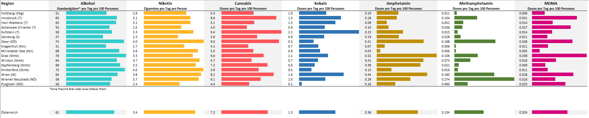 Die größten Pro-Kopf-Konsummengen des Wirkstoffs Amphetamin (Speed) ließen sich in Graz nachweisen, beim Konsum von Metamphetamin (Crystal Meth) führen Wiener Neustadt und Steyr. Der MDMA (Ecstasy) Konsum scheint in urbanen Regionen höher zu sein, als in ländlichen, der Spitzenwert wurde dabei auch hier in Graz beobachtet. Die West-Ost-Verteilung von Stimulanzien und synthetischen Drogen ist nicht auf Österreich beschränkt, sondern spiegelt sich in Europa wider.