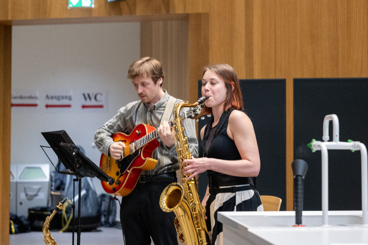 Ein musikalisches Duo eröffnete eröffnete die Feierstunde im Audimax der Med Uni Innsbruck, anschließend begrüßte Rektor Wolfgang Fleischhacker die sechs Habilitand:innen und alle Gäste. Francesco Ferraguti, Direktor des Instituts für Pharmakologie, hielt einen Impulsvortrag zum Thema „Was ist das Ziel des Cluster of Excellence: Neuronal Circuit in Health and Disease?“