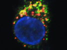 Fluoreszenzaufnahme: FPR3 (grün) und Lipocalin (rot) treffen in Endosomen (gelb) von dendritischen Zellen (Zellkern in blau) aufeinander (c) C.Heufler