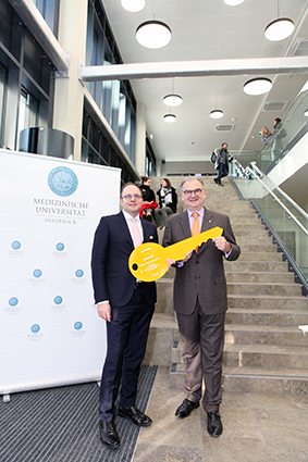 BU: Maximilian Pammer, Leiter des Unternehmensbereichs Universitäten bei der BIG, übergibt symbolisch den Schlüssel an Rektor W. Wolfgang Fleischhacker. (Fotos: MUI/D. Delius)