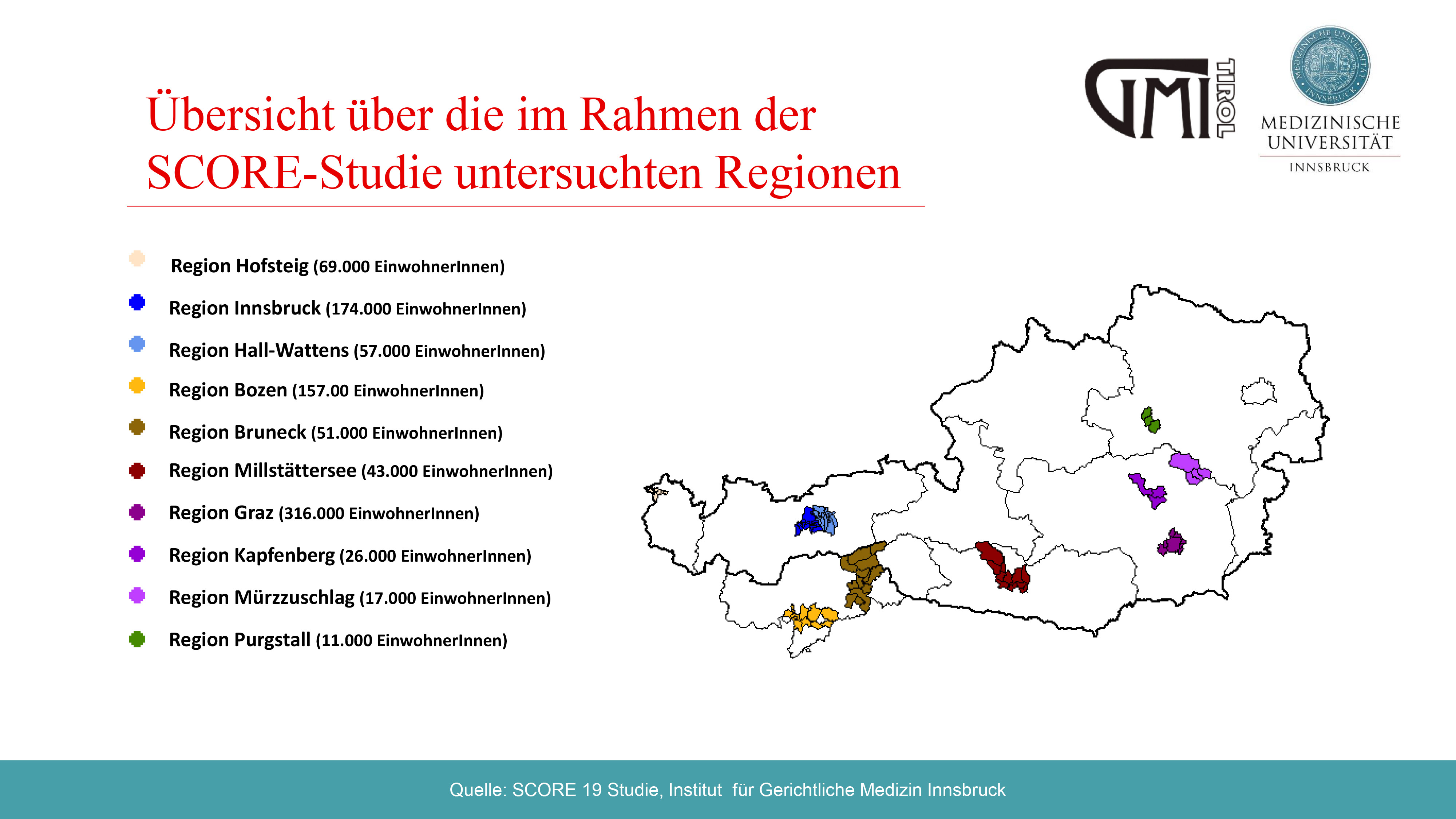 Federführend für die Untersuchungen zeichnet Herbert Oberacher, Leiter des forensisch-toxikologischen Forschungslabors an der von Richard Scheithauer geführten Innsbrucker Gerichtsmedizin. Aufgrund der vorhandenen Expertise und Qualität darf das Innsbrucker Labor als einzige Einrichtung Österreichs am SCORE-Programm teilnehmen. „Besonders stolz sind wir auf den Umstand, dass die Ergebnisse unserer chemischen Analysen von der Europäische Beobachtungsstelle für Drogen und Drogensucht (EMCDDA) in Lissabon für den europäischen Drogenbericht verwertet werden“, berichtet Oberacher. Mit hochmodernen und entsprechend nachweisempfindlichen Analyseverfahren kann die Zusammensetzung von Abwässern im GMI-Labor exakt entschlüsselt werden. Mit den vorliegenden Ergebnissen ist es somit möglich, den Drogenkonsum von zumindest 9% der österreichischen, 30% der Tiroler, 29% der Steirer, 18% der Vorarlberger, 8% der Kärntner, 1% der Niederösterreicher und 40% der Südtiroler Bevölkerung abzubilden.