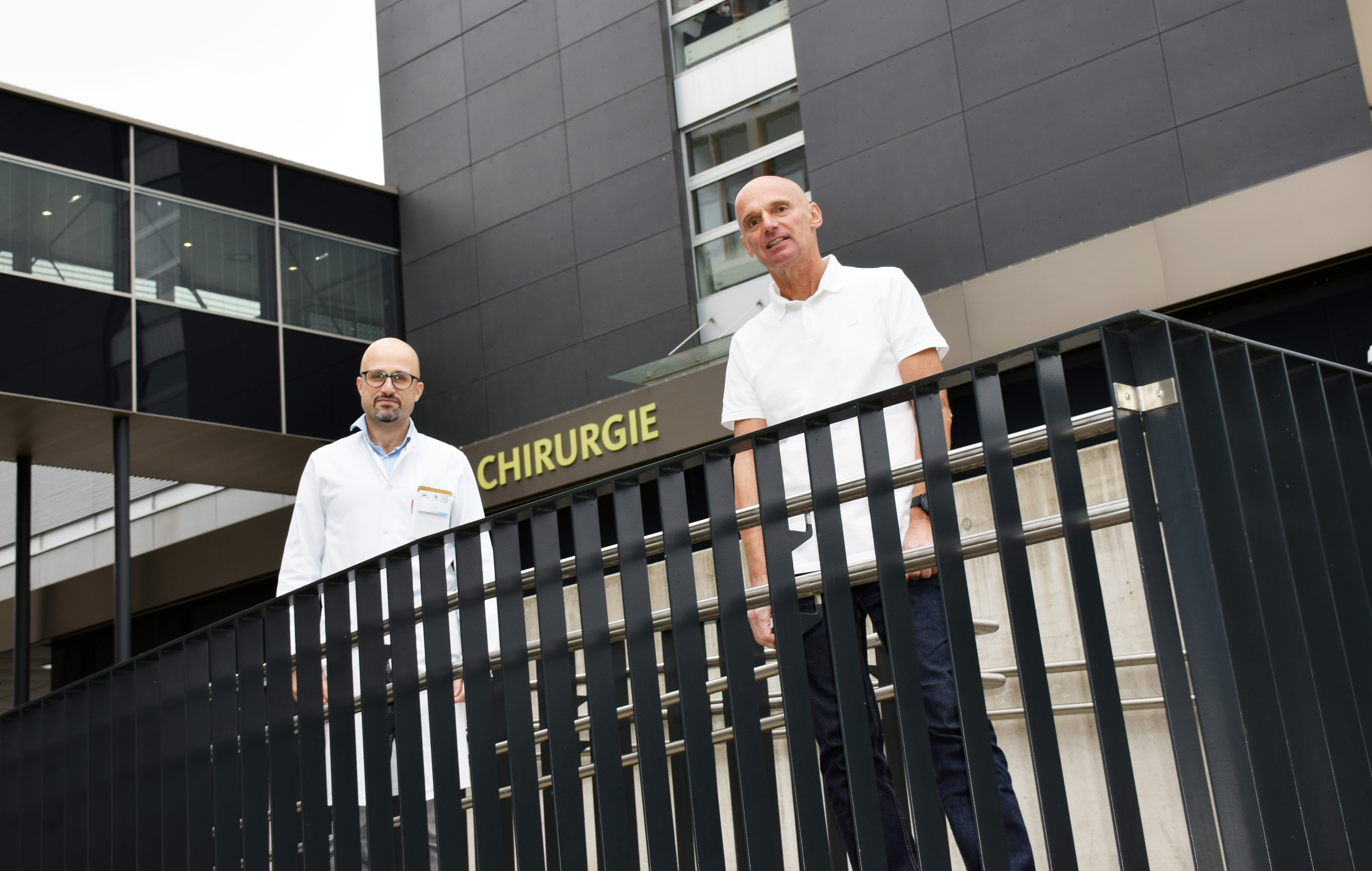 Bild: v.l.: Chirurg Manuel Maglione und Laborleiter Jakob Troppmair vor der Innsbrucker Chirurgie, (c)MUI/Bullock