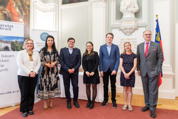 v.l.: Ulrike Tanzer (Vizerektorin für Forschung, Universität Innsbruck), Bildungsministerin des Fürstentums Liechtenstein Dominique Hasler, die Preisträger*innen Egon Demetz, Monica Fernández-Quintero, Christian Obermayr, Elisa Harris und Wolfgang Fleischhacker (Rektor Medizinische Universität Innsbruck)