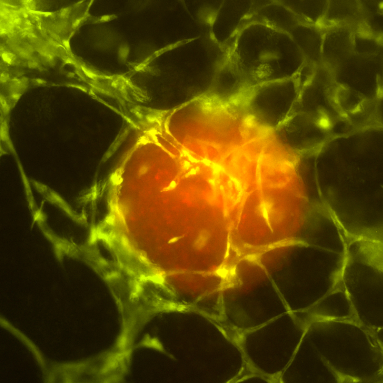 BU: Tumorbild: Rot fluoreszierende Tumorsphäre in biogedrucktem Gewebe.
