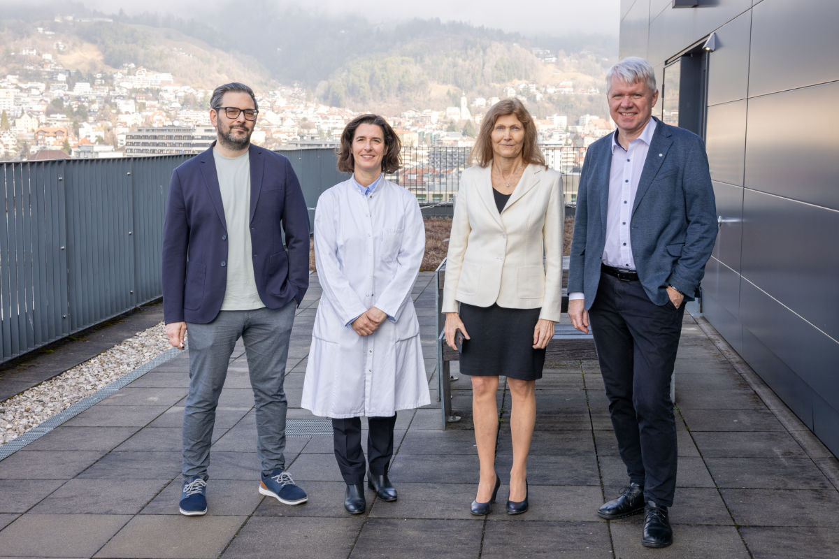 v.l.: Philipp Zelger, Professor für Experimentelle Audiologie, Simone Graf, Direktorin der Univ.-Klinik für Hör-, Stimm- und Sprachstörungen (HSS), MED-EL Gründerin und Leiterin Ingeborg Hochmair und Med Uni Innsbruck Rektor Gert Mayer. (c) MUI/F. Lechner (Foto: MUI/F. Lechner)