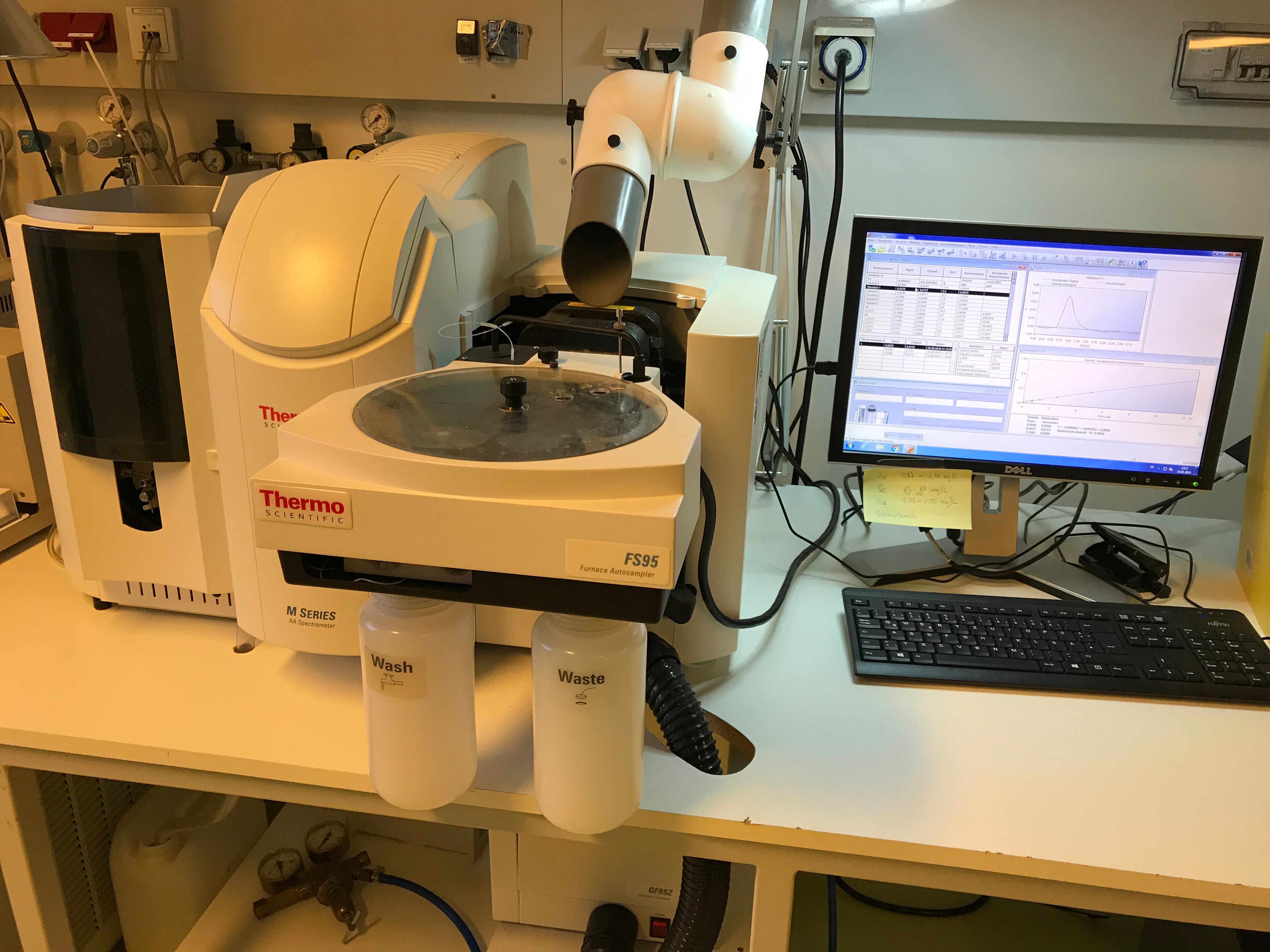 Solaar M6 Dual Zeeman spectrometer (ThermoScientific) with continuum source (QuadLine) and Zeeman background correction system.