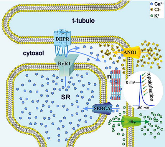 The core mechanism of skeletal muscle contraction involves excitation of the sarcolemma, leading to release of Ca2+ from intracellular SR stores. This complex process, known as excitation-contraction (EC) coupling, involves the close interaction of two distinct Ca2+ channels: the voltage-gated L-type Ca2+ channel or dihydropyridine receptor (DHPR) present on the sarcolemma, and the intracellular Ca2+ release channel or ryanodine receptor (RyR1) in the SR. Our main research aim is to elucidate the structure-function relationship of this fascinating bidirectional Ca2+ channel crosstalk in skeletal muscle. We have mapped the functional domains in the DHPR α1S and β1a subunits that are crucial for this protein-protein signal transduction. Another interesting focus of our research is on understanding the duality of the DHPR as the voltage-sensor and Ca2+ channel, using phylogenetic approaches and with the involvement of a newly identified Ca2+-activated Cl- channel in this process.