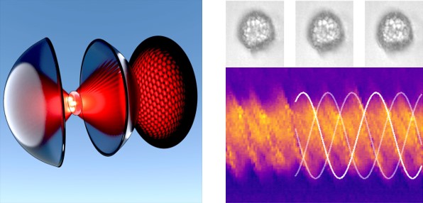 The group is also part of the interdisciplinary FWF-SFB Tomography across the Scales, a collaboration between experimental Applied Optics groups and mathematicians specialising in ‘inverse problems’ in Vienna, Linz and Innsbruck. The problems investigated span a huge range, from the nano-world to galactic dimensions, with a common theme of similarities in the mathematical approaches to the extraction of information from the measured data. In our case, we use the ‘sono-optical’ trapping device to rotate unicellular micro-organisms and cell clusters (organoids, cancer spheroids) for 3D inspection and tomographic reconstruction, see Fig. 1 (right).