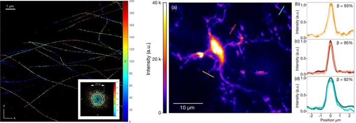 One recent focus was on the exploitation of near-field effects (supercritical angle fluorescence emission) to improve spatial resolution along the optical axis. The cells are brought into contact with an antigen-functionalised lipid bilayer, which is prepared on a glass coverslip. TIRF illumination restricts the excitation zone to a region that is a few hundred nm thick, which can be resolved in 3D at resolutions down to about 10 nm. Fig. 2 (left) shows an exemplary image of stained microtubules in COS-7 cells. The resolution allows detection of the hollowness of the tubulin structures.