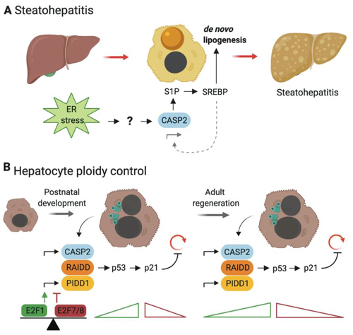 - E2F-Family Members Engage the PIDDosome to Limit Hepatocyte Ploidy in Liver Development and Regeneration. Sladky VC, Knapp K, Soratroi C, Heppke J, Eichin F, Rocamora-Reverte L, Szabo TG, Bongiovanni L, Westendorp B, Moreno E, van Liere EA, Bakker B, Spierings DCJ, Wardenaar R, Pereyra D, Starlinger P, Schultze S, Trauner M, Stojakovic T, Scharnagl H, Fava LL, Foijer F, de Bruin A, Villunger A., Dev Cell. 2020. Feb 10; 52(3): 335-349.e7.