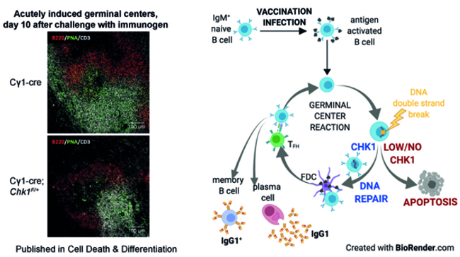 - CHK1 dosage in germinal center B cells controls humoral immunity. Schoeler K, Jakic B, Heppke J, Soratroi C, Aufschnaiter A, Hermann-Kleiter N, Villunger A, Labi V., Cell Death Differ. 2019. Dec; 26(12): 2551-67.