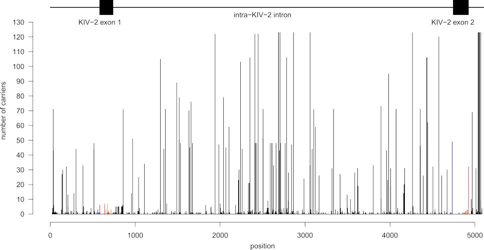 A major part of our work concerns the investigation of mutations in the KIV-2 repeat region of the LPA gene. By combining the computational expertise of the institute in the detection of low-level mutations and our long-standing experience in Lp(a) research, we have developed a sequencing approach that is capable of resolving the variability in this large region. A screen of 123 individuals revealed an unprecedented level of genetic variability, with several hundred novel variants, some of which strongly regulate Lp(a) concentrations (J Lipid Res 2019; Genome Medicine 2020) (Fig. 2). Several variants identified in the KIV-2 region as well as the rest of the LPA gene are now characterised by genetic and functional analyses to improve understanding of the genetic architecture of Lp(a).