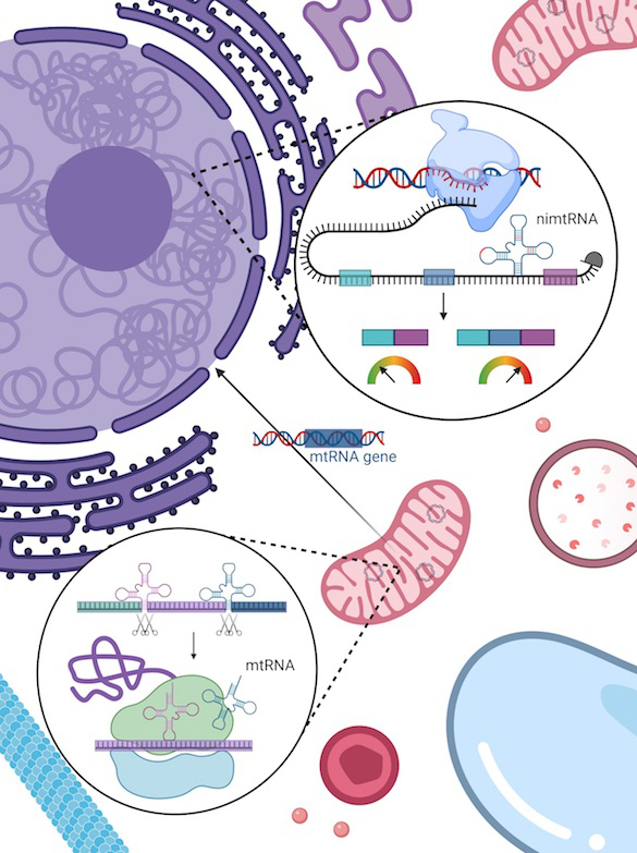 The mitochondria of eukaryotic cells contain their own genome, which is derived from a bacterial ancestor and separate from the nuclear genome. During mammalian evolution, parts of the mitochondrial genome were integrated into the nuclear genome, including mitochondrial tRNAs that are partly found within intronic regions of nuclear genes. We investigate the processing and function of nuclear intronic mitochondrial-derived tRNAs (nimtRNAs) and their intergenic counterparts, as well as the mechanisms associated with these (Fig. 2).