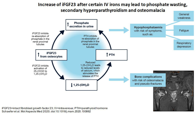 To assess why this side effect can cause long-term and sometimes irreversible complications, a comprehensive range of mineral and bone metabolism parameters has been included. In line with the clinical observations, hypophosphataemia in patients treated with ferric carboxymaltose was caused by high concentrations of the peptide hormone FGF23, which triggered a decrease in active vitamin D, hypocalcaemia and secondary hyperparathyroidism. To summarise the complex changes elicited by ferric carboxymaltose in patients with iron deficiency, we recently coined the term ‘6H syndrome’(Schaefer et al., Mol Aspects Med 2020; 75: 100862).