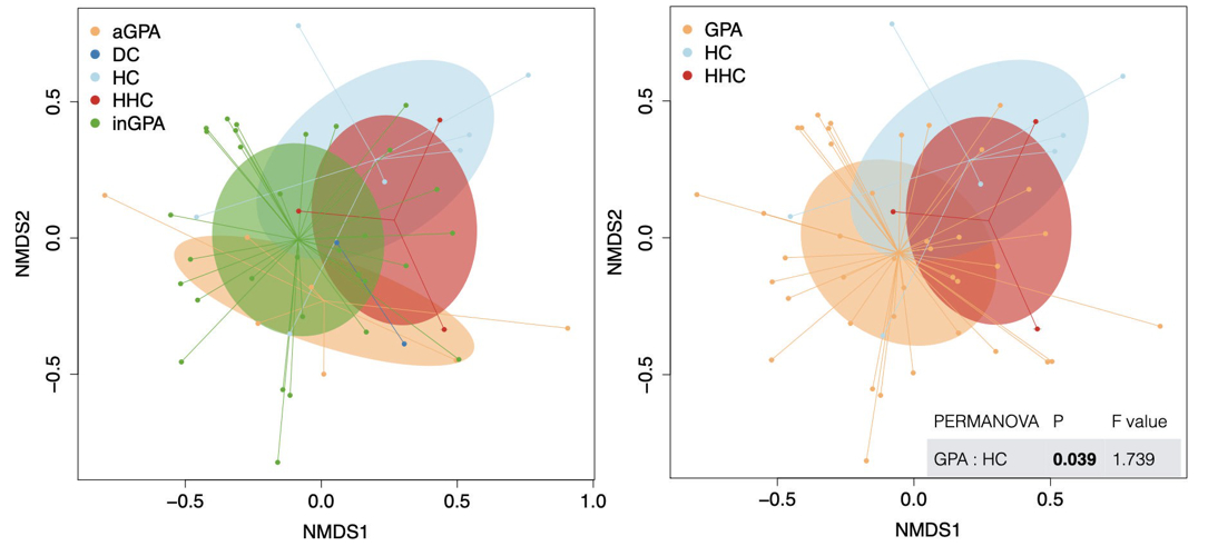 Fig. 3.: NMDS analysis of bacterial 16S marker gene sequenced species. a) The healthy control cluster separates the majority from the inactive and active GPA cluster. b) The GPA cluster (including active and inactive cases) was statistically different from the healthy control cluster.