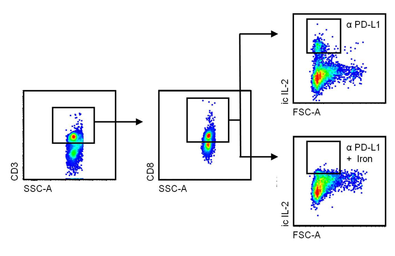 While many of the negative effects of iron on the course of infections are linked to iron storage in macrophages, surplus iron also impairs the function of lymphocytes. In mammary carcinoma, we found that dietary iron supplementation promoted tumour growth, because iron impaired the production of interleukin (IL)-2 and interferon (IFN)-γ, two major cytokine products of CD8+ cytotoxic T-cells (Fig. 2). Importantly, dietary iron supplementation also undermined the anti-tumour effects of immunotherapy and resulted in reduced response to treatment with a monoclonal antibody blocking the programmed cell death ligand (PD-L)-1, administered as a checkpoint inhibitor.