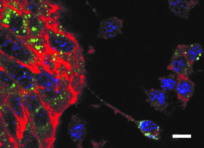 Fig. 3: Co-culture of Kupffer cells (small cells in the right section of the figure) and hepatocytes(conglomerate of large tubulin-rich cells in the left section of the figure). After loading of Kupffercells with cholesterol, the transfer of cholesterol to adjacent hepatocytes can be observed. Blue: DAPI.Red: tubulin. Green: cholesterol. Scale bar: 10 µm. This diagram is provided courtesy of Egon Demetz.