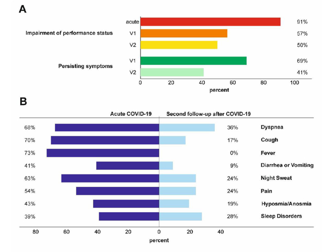 Fig. 4: Persisting symptoms 6 (V1) and 12 (V2 = second follow-up) weeks after COVID-19 infection, as assessed by systematic cardiopulmonary follow-up in an observational prospective multicentre trial.