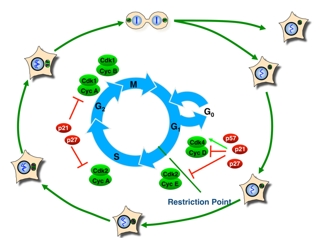 The decision to continue proliferation or to exit from the cell cycle into quiescence is usually made during a specific window of the eukaryotic cell division cycle. This cell cycle can be subdivided into four phases: gap phases G1 and G2 separate DNA replication during the S-phase from segregation of the duplicated DNA and other cellular components in the M-phase (mitosis and cytokinesis). Cells can decide to withdraw from proliferation or to commit to another round of cell division until they progress over the so-called restriction point, a specific point in phase G1 (Fig. 1). Progression over the restriction point renders cells mitogen-independent and they become committed to undergoing another complete cell cycle including S-phase and mitosis.