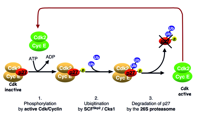 p27 regulates cell cycle progression over the restriction point. Abundant p27 binds and inactivates CDKs and can prevent cell proliferation. The CDK inhibitor protein becomes unstable upon cyclin/CDK2 activation, as cells traverse the restriction point and progress towards the S-phase. A positive feedback loop couples p27 ubiquitin-dependent degradation to CDK activation (Fig. 2). The molecular mechanism that can initiate this feedback loop in the presence of abundant CDK inhibitors and thus inactive CDKs has long remained an enigma.