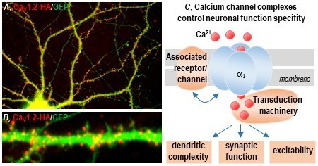 Voltage-gated calcium channels (VGCCs) are key regulators of important neuronal functions, including synaptic transmission and plasticity, gene transcription, membrane excitability, shaping of the dendritic tree and axonal guidance. Genetic studies increasingly associate calcium channel mutations with severe neurological and psychiatric diseases. However, the lack of information concerning calcium channel neurobiology is a major impediment to the assessment of channel-aetiological power and the development of novel and tailored therapeutic applications. We study the mechanisms that control calcium channel trafficking, the assembly of channel complexes and their regulation of activity, and the stimulation of G-protein-coupled receptors. We investigate how the integrity of calcium channel signalling complexes as well as their distribution and modulation affect the development of the dendritic tree, synaptic function and membrane excitability. Our experimental approach includes molecular cloning, biochemistry, electrophysiology and mainly high-resolution fluorescence imaging techniques on cultured neurons. In particular, we have developed a specialised method portfolio for cell cultures, which includes single-molecule tracking, fluorescence recovery after photobleaching, calcium imaging, synaptic fluorescent indicators and protocols of immunofluorescence – all of which are able to analyse synaptic function, signalling efficacy and channel trafficking in real time in neuronal subcellular domains.