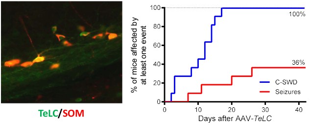 In human temporal lobe epilepsy, seizures mainly arise from structures of the hippocampal formation. The electrical activity of excitatory (glutamatergic) neurons in the hippocampus is tightly controlled by a variety of distinct subclasses of GABAergic interneurons. To investigate the effect of a loss or malfunction of certain groups of GABA interneurons on epileptogenesis, we use transgenic mice, which allow cell-specific overexpression of tetanus toxin light chain (TeLC) introduced by stereotactic injections of a respective viral vector (AAV) into the hippocampus. TeLC is then selectively expressed in GABA/parvalbumin, GABA/somatostatin or GABA/VIP interneurons at the injection site and impairs neurotransmitter release from these neurons. We then monitor EEG activity in these mice for six weeks and check the development of epilepsy. To date, we have shown that selective silencing of GABA/parvalbumin neurons in the subiculum leads to spontaneous limbic seizures and a decreased seizure threshold, which highlights the crucial role of these neurons in the manifestation of temporal lobe epilepsy. More recently, we have shown that silencing of GABA/somatostatin neurons, but not GABA/VIP neurons, may also lead to the development of spontaneous recurrent seizures (i.e. epilepsy). In the future, we aim to investigate further groups of GABA interneurons in the hippocampus (containing GABA/calretinin, GABA/Chrna2 or GABA/VGLUT3).