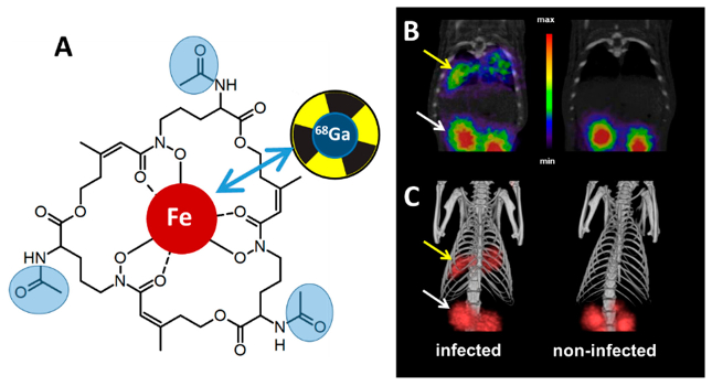 Characterisation of siderophore-mediated iron acquisition and storage. Characterisation of fungal mechanisms for iron sensing and regulation. Metabolic linking of iron regulation, e.g. to ergosterol biosynthesis, hypoxia adaptation and leucine biosynthesis. In vivo PET (positron emission tomography) imaging of fungal infections using 68Gallium-labelled siderophores in animal models (Fig. 1, collaboration with Dr. Clemens Decristoforo, Department of Nuclear Medicine). Proof of concept for siderophores (triacetylfusarinine C) as urine biomarkers for aspergillosis.
