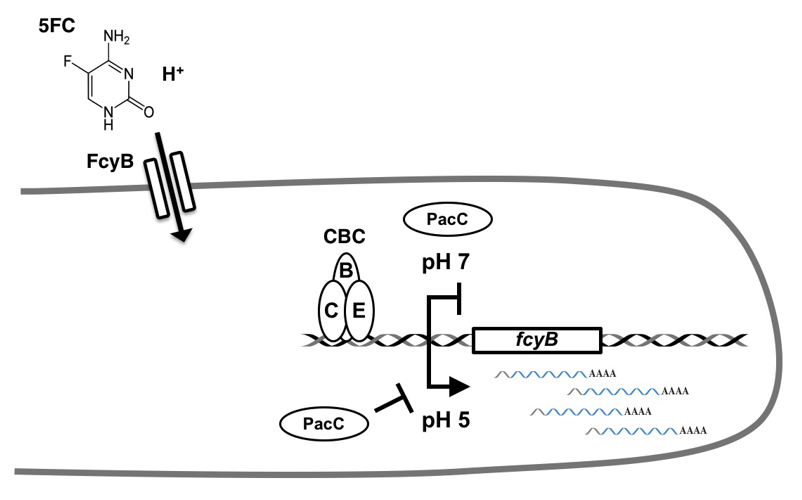 Elucidation of the molecular cause underlying one of the predominant resistance mechanisms found in A. fumigatus clinical isolates that leads to treatment failure. Discovery of the gene regulatory mechanism that confers intrinsic resistance on antifungal nucleobase analogue 5-fluorocytosine (Fig. 4).