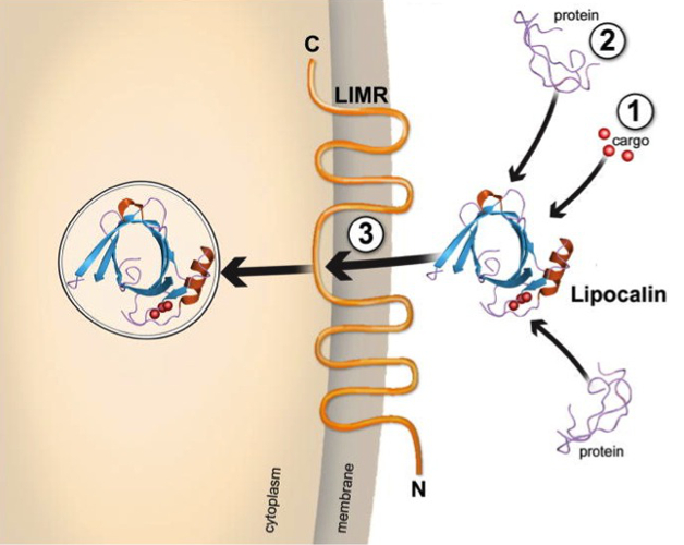 We investigate structural and functional features of human lipocalins. The lipocalin superfamily consists of small, mainly secretory proteins defined on the basis of conserved amino acid sequence motifs and their common structure. Functionally, these are important extracellular carriers of lipophilic compounds in vertebrates, invertebrates, plants and bacteria. There is increasing evidence that this group of proteins is involved in a variety of physiological processes, including retinoid, fatty acid and pheromone signalling, immunomodulation, inflammation, detoxification, modulation of growth and metabolism, tissue development, apoptosis, and even behavioural processes. Whereas the structural basis of lipocalin-ligand binding is now well-understood, there is a major lack of knowledge with regard to the mechanisms by which lipocalins exert their biological effects. This is mainly due to the fact that only limited data are available on lipocalin receptors and lipocalin receptor interactions, although it is well accepted that many, if not all, of these proteins are able to bind to specific cell receptors. Our main research focus is on the identification of cellular lipocalin receptors, the characterisation of the molecular mechanisms of receptor-ligand interaction and the biological processes beyond receptor binding (Fig. 5). In addition, we study novel functions of lipocalins in innate immunity and allergy.