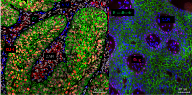 E-cadherin shows a decreasing gradient towards the periphery of the cancer cell nests. Slug-positive, dedifferentiated tumour cells are in epithelial-mesenchymal transition and E-cadherin negative.