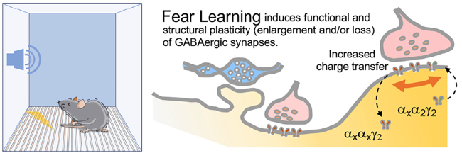 Fig. 1: Fear learning induces functional and structural plasticity of amygdala GABAergic synapses. Kasugai et al. showed that associative learning, such as fear conditioning, elicits concerted structural and functional plasticity of amygdala GABAergic synapses. This process regulates both somatic and dendritic inhibition and may tune amygdala circuit responses to threat.