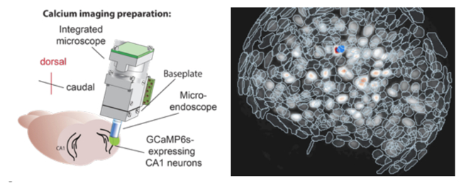 Fig. 2: Single-cell deep Ca2+ imaging in the ventral CA1 field of the hippocampal formation. Calcium imaging preparation using virally transfected GCaMP, a GRIN lens implanted above CA1 and a miniscope, allowing free movement of the animal. The image on the right shows a field-of-view through the GRIN lens overlayed with the spatial filters of the 246 identified neurons.