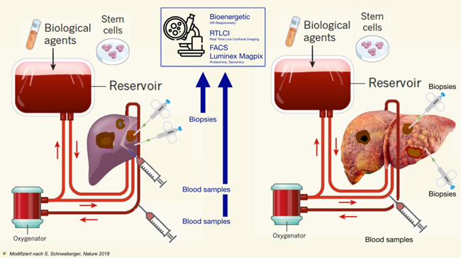 Our aim is the targeted treatment of damaged organs, in order to restore functionality. Together with a comprehensive collection of technologies and instruments for in-depth analysis of tissue and perfusate composition, molecular biological morphology, viability and bioenergetic function, our setup is ideally suited both to the assessment of machine-perfused organs used in our clinical work and to experimental studies.