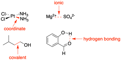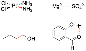 a) Bildzuordnung: Bitte ordnen Sie den Molekülen in der Abbildung die folgenden Wechselwirkungen zu: kovalente Bindung, Wasserstoffbrückenbindung, ionische Wechselwirkung, koordinative Bindung